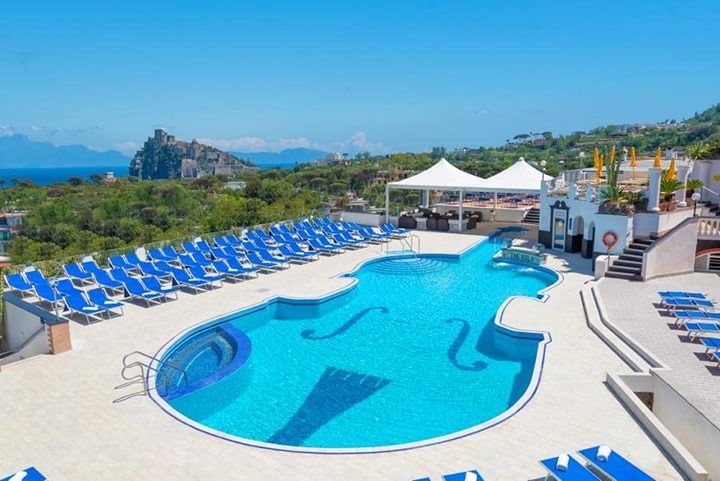 In zona leggermente Collinare ad Ischia Porto, e con Vista sul Castello Aragonese e Golfo di Napoli.